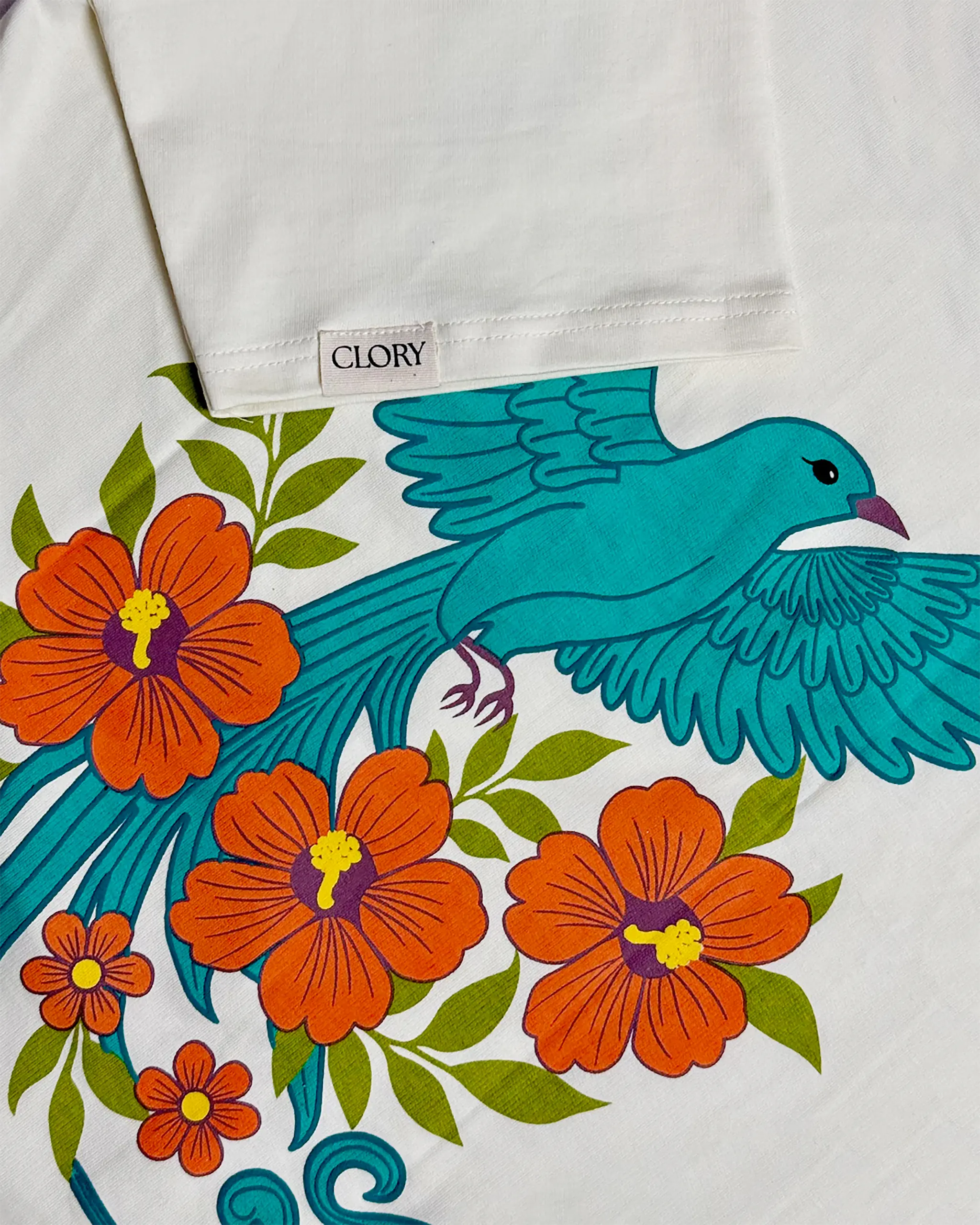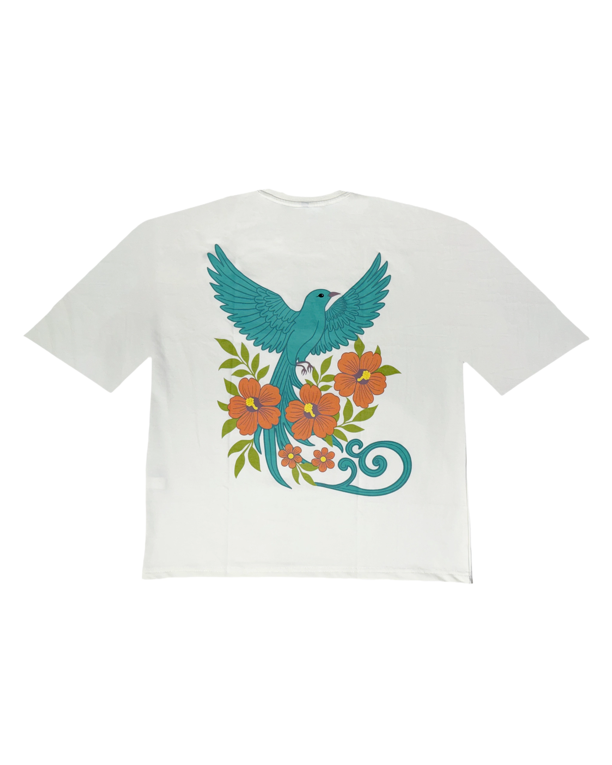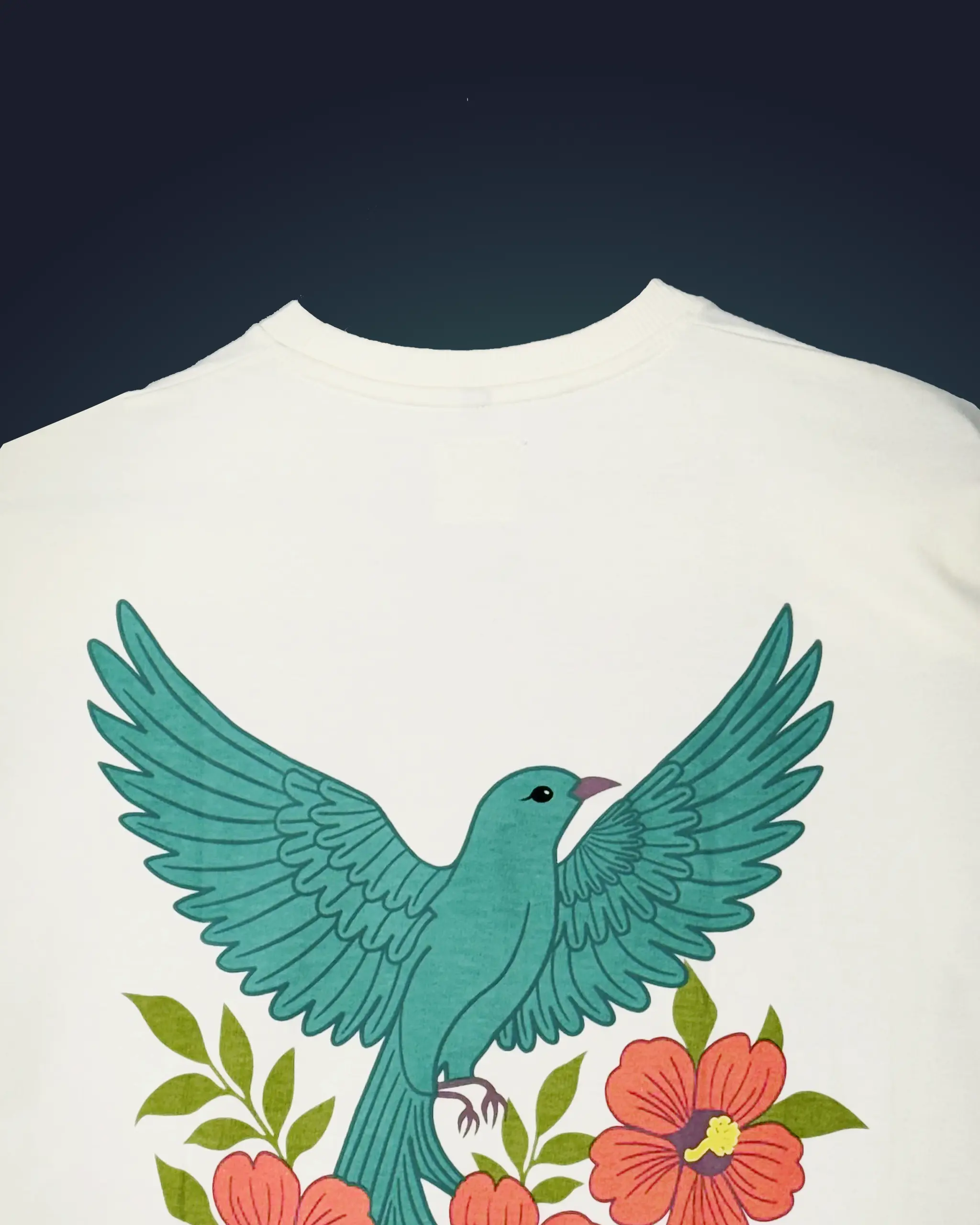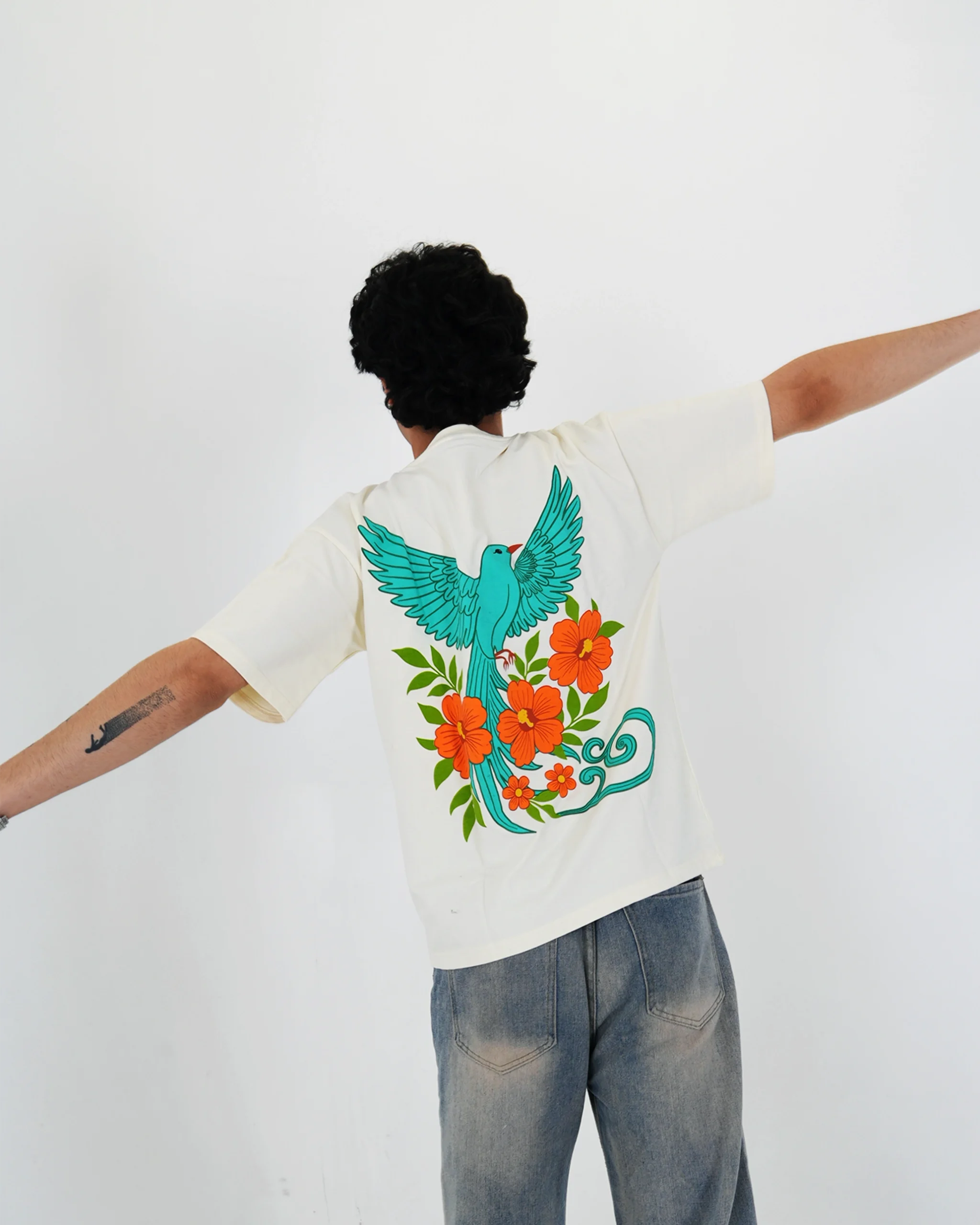 Gracefully taking flight, Wings of Bloom features a striking teal bird soaring among orange hibiscus blooms and lush green leaves. Symbolizing freedom, hope, and harmony with nature, this intricate artwork on this premium oversized t-shirt is crafted to make you feel effortlessly bold and beautifully grounded. The puff on the t-shirt adds depth and richness, making each piece feel truly one-of-a-kind. Perfect for elevating your casual style with an artistic, nature-inspired touch.